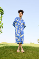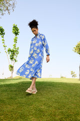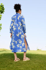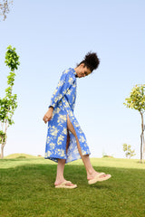 The Daisy Midi Dress is crafted from our linen cotton fabrication in our floral sky print. It has pleat detailing in the neck & sleeves with both side slits.