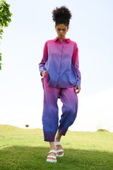 Our Marigold Co-ord Set is crafted from linen cotton fabric. It includes a button down shirt in our shades of summer print paired with our paneled trouser with stitch detailing.
