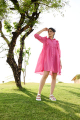 The Veronica button-down short dress is crafted from our check fabric azo free dyed. This dress has frill detailing in the front and looks perfect for your Sunday brunch.