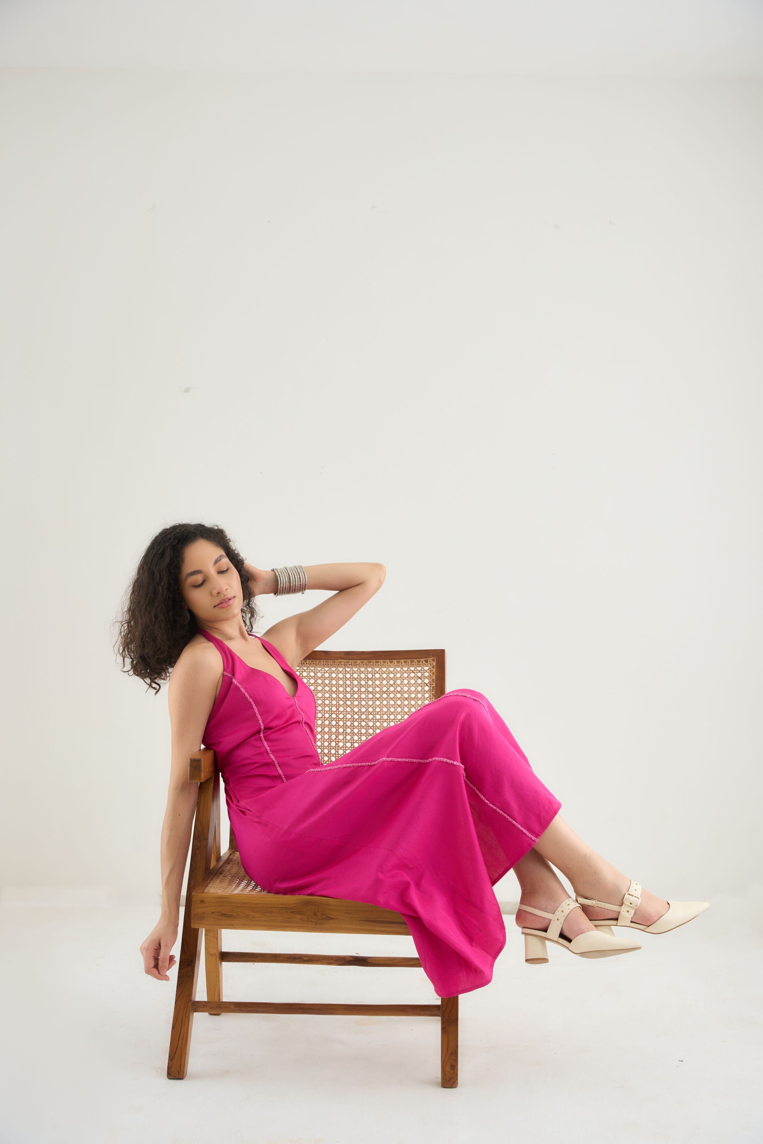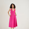 The imperial halter dress is crafted from vegan silk fabric, The dress has beaded detailing in the seamline adding a playful touch to the silhouette.