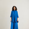 This coord set is crafted from Vegan Silk fabrication. The Kurta has a Lapel Collar with quarter sleeve embellished with Lace detailing. The kurta has a side in-seam pockets with fagoetting detail. The bottom is of same colour and a wide leg pants with lace detail to compliment the entire look.