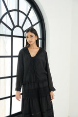 The black beauty jacket is made of cotton silk fabrication along with lace detailing at the neck, hem and sleeves.