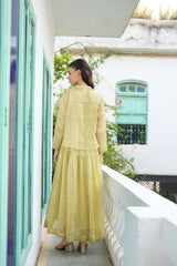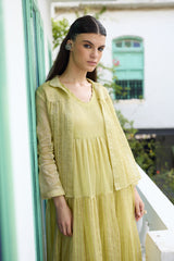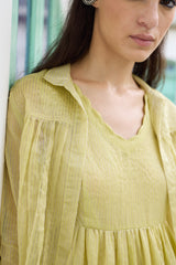 The heer jacket is crafted with hand woven striped chanderi fabrication with gather detailing.