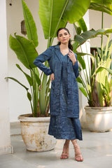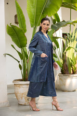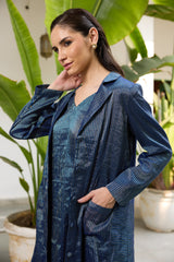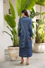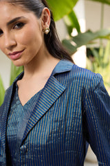 The koki jacket is crafted from our blue tissue striped fabrication with front pockets.