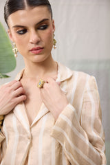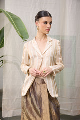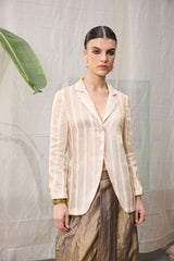 The mrunal jacket is crafted from our hand woven zari striped chanderi fabrication with front button.