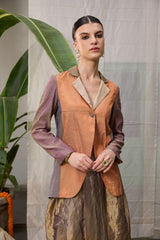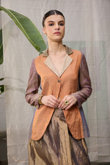 The mrunal jacket is crafted from our hand woven zari striped chanderi fabrication with front button.
