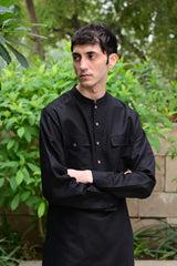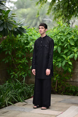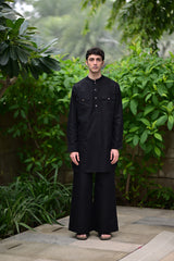 The kurta set is crafted from linen cotton fabrication with shell button detailing.
