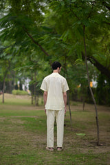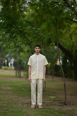 The shirt is crafted from linen cotton fabrication with shell button detailing.