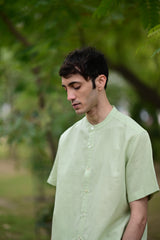 The shirt is crafted from linen cotton fabrication with shell button detailing.