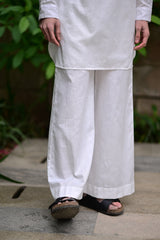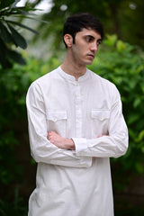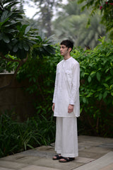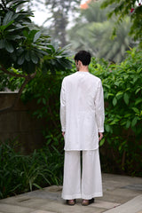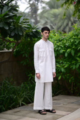 The kurta set is crafted from linen cotton fabrication with shell button detailing.