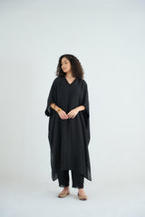 Our Signature Kaftan is crafted from the softest cotton silk fabric along with lace detailing in the sleeves & neck to make it suitable for the festive season. It is paired with our narrow hem pants which are made of vegan silk fabric and the hem has lace detailing to compliment the entire look.