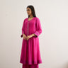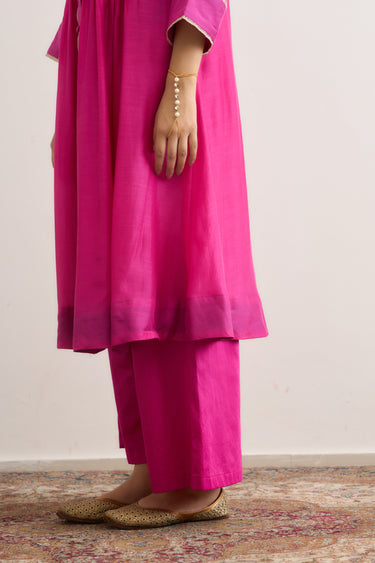The Tulip Kurta set blends well into modern desi look. The cotton silk kurta has pin tucks all over the front panel along with minimal gold lace detailing. It is paired with relxed fit multi purpose pants.