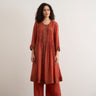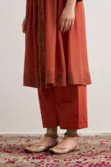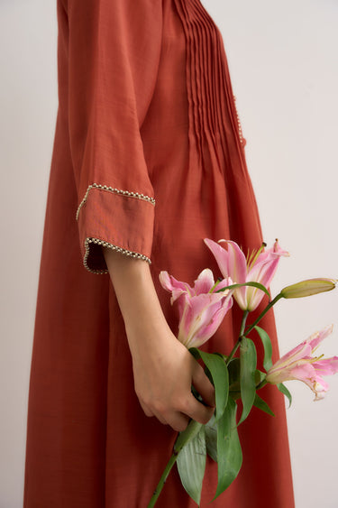 The Tulip Kurta set blends well into modern desi look. The cotton silk kurta has pin tucks all over the front panel along with minimal gold lace detailing. It is paired with relxed fit multi purpose pants.