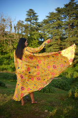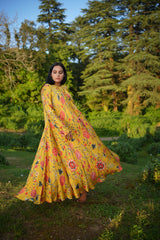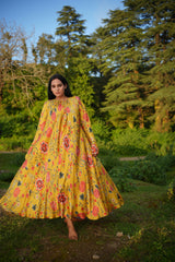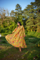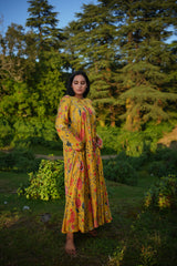 The Laxmi maxi dress is crafted from our vegan silk fabrication in our Daal Print. It has gather detailing in the neck along with chudidaar sleeves.