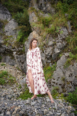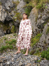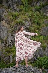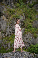 The Laxmi maxi dress is crafted from our vegan silk fabrication in our Daal Print. It has gather detailing in the neck along with chudidaar sleeves