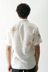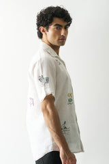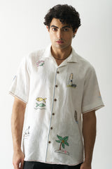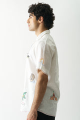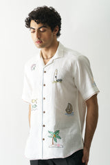 collar half sleeve white shirt featuring a beach theme design. Impeccably crafted, this shirt showcases intricate hand