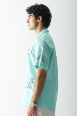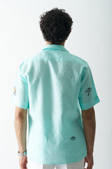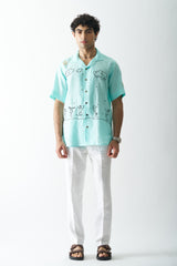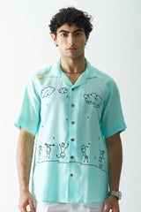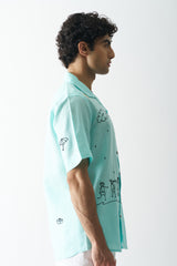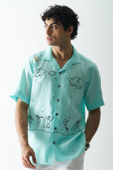 Experience the joy of childhood and the magic of nature with our linen cuban collar half sleeve aqua blue shirt. The front side showcases an endearing scene of children playing in the rain, while the backside features a meticulously hand-embroidered boat. Adding a whimsical touch, the sleeves boast a vibrant rainbow design. Embrace the beauty of youthful imagination and nature's wonders with this captivating shirt.