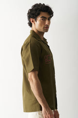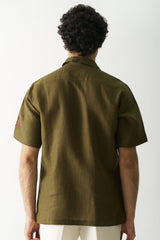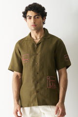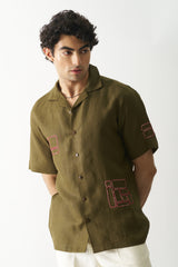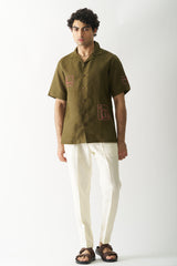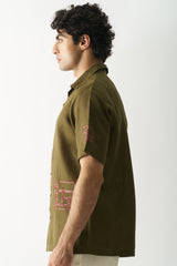 Elevate your style with our Hand-Embroidered Dark Olive Green Shirt. Featuring intricate square and rectangle designs on the front and sleeves, it's a blend of elegance and artistry. Discover sophistication in every stitch
