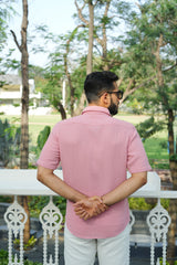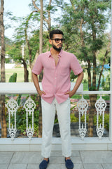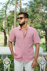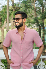 The shirt is crafted from crinkled muslin fabrication with shell button detailing.