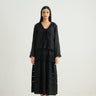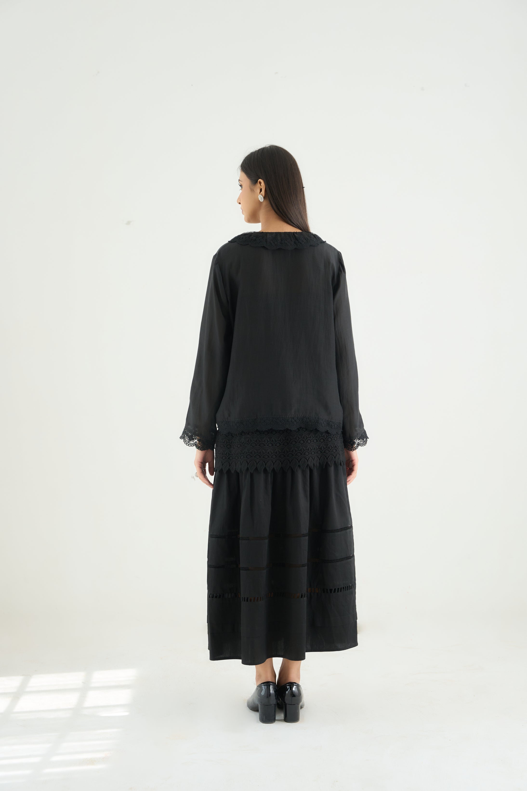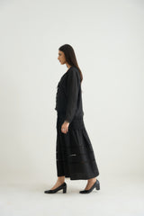 Perfect for the new years, This outfit outstands all of it. The jacket is crafted with cotton silk fabric with lace detailing all over the neck, hem & sleeves paired with the vegan silk skirt of the season which has multiple lace & pleat detailing.