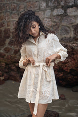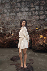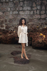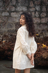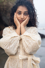 The cookie dress is made from our hakoba embroidered fabric in natural shade. The sleeve are exaggerated with a belt attachment which can we styled in multiple ways.