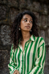 The maria co-ord set is made from our cotton silk fabrication for shirt and linen cotton fabrication for pants which is printed in our hand painted stripe print. It is the most comfortable lounge wear set one can have for the season.