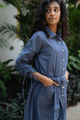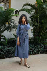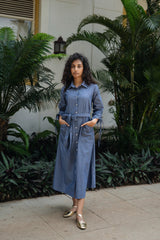 The maria dress is made from our chambray fabrication. It has a cotton denim feel which makes it suitable for a semi formal occasion. It is a front open button down A line dress with flexible sleeve detailing.