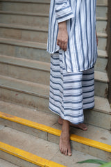 Maria kurta is made from our madras yarn dyed striped fabric in blue and white colour. The kurta is an anti fit with dropped sleeves with kurta placket detailing.