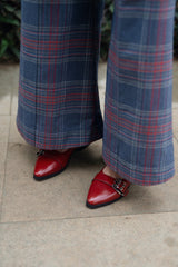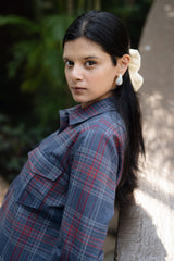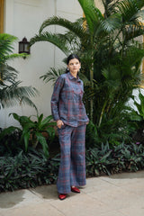 The roma shirt set is made from cotton chambray fabrication. The shirt has two pleated pockets at the front with bell trousers.