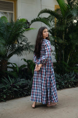 The roosh dress is made from our madras checks fabrication. It has smocking detailing on the upper body with gathers under the bust to give a good shape.
