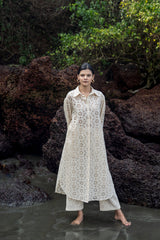 The zinnia embroidered dress is made of hakoba embroidered fabric. It is a button down dress with a belt attachment which can be styled in multiple ways.