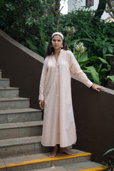 The cosy dress is made from our yarn dyed linen cotton fabrication. It has gather detailing at the neck and its anti fit pattern makes it a perfect lounge wear.