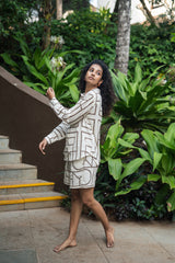 Diana set is made from our cotton linen fabrication in geometric print. It has a relaxed fit shirt paired with shorts.