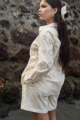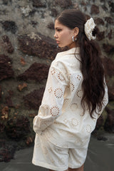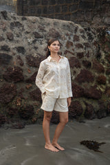 Diana set is made from our hakoba embroidered fabric which has a relaxed fit shirt and shorts which is lined with mulmul.