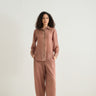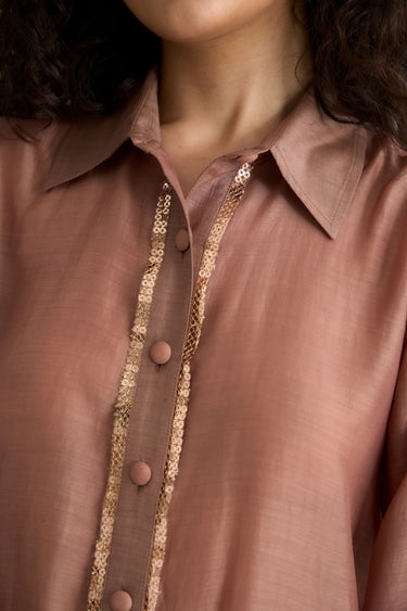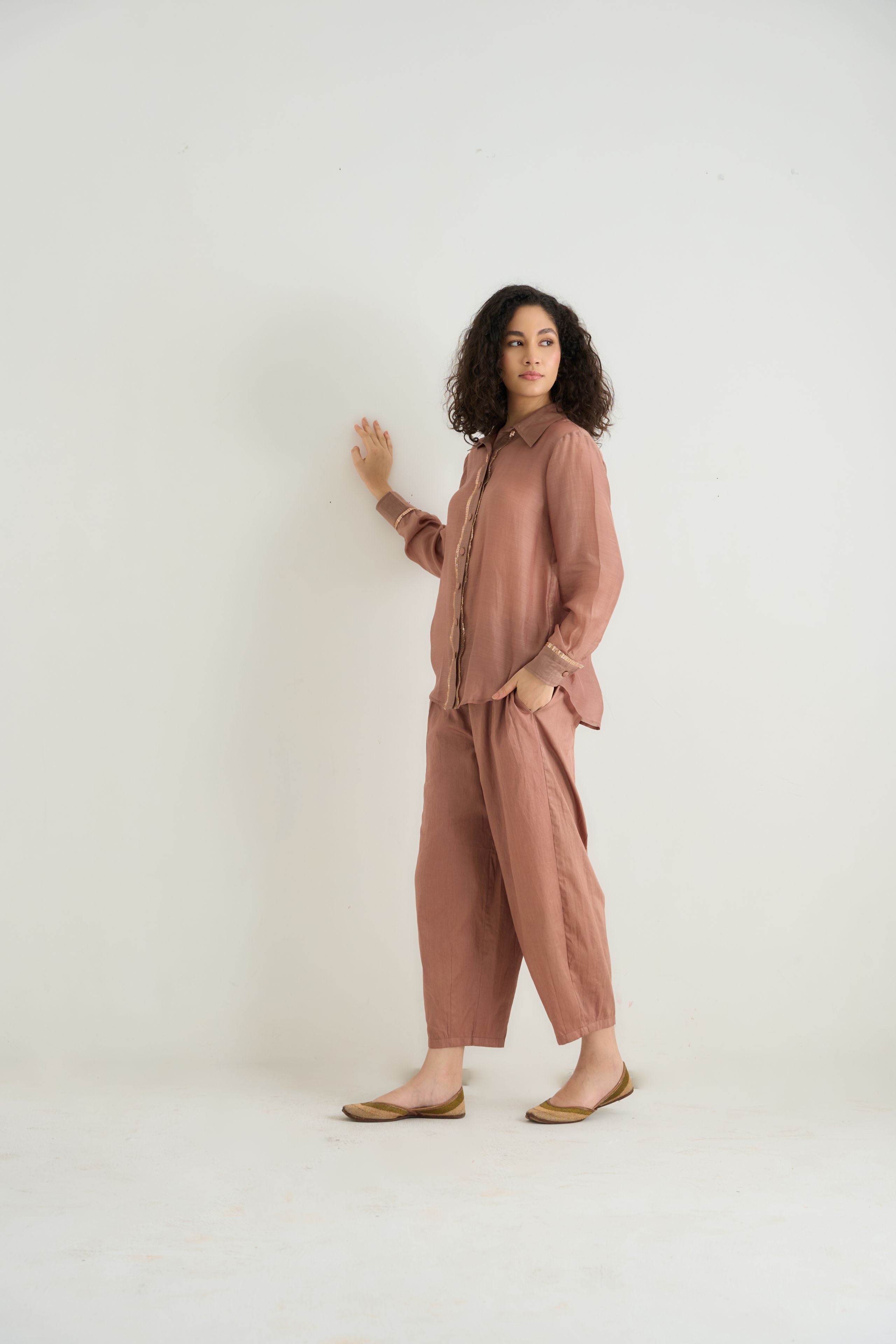 Gingerale Cocktail special, This Ginger coord set is perfect for a feminine feel to celebrate woman. The cotton silk shirt has front sequence detail paired with ankle fit pant.