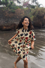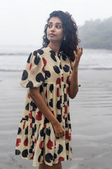 The layla dress is made from our cotton silk fabrication in painted polka print. This dress is a three tier short dress with balloon sleeve detailing.