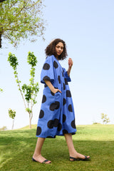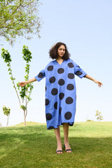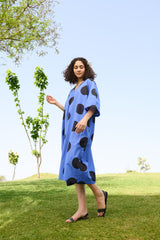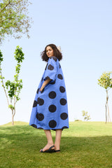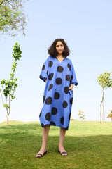The Marie Dress is crafted from our linen cotton fabrication in our Small polka blue print. This is a V neck oversized dress with pockets.