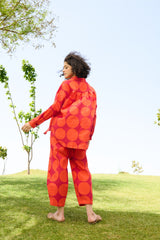 Our Marigold Co-ord Set is crafted from linen cotton fabric. It includes a button down shirt in our red polka print paired with our paneled trouser with stitch detailing.