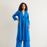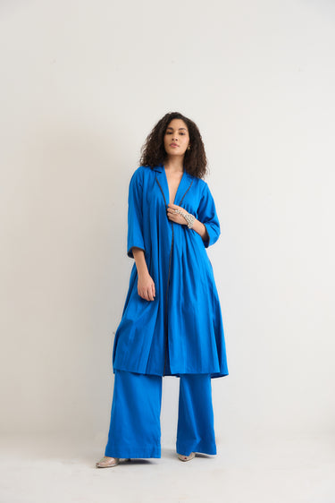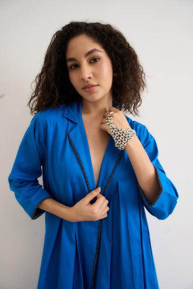Showstopper, The Passion flower set is crafted from vegan silk fabric. The jacket has pleat detail along with bead detailing in the collar.
