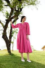 The Shringara Dress is crafted with our checkered cotton fabric in the prettiest of azo free pink color with elasticated detailing at the bust.